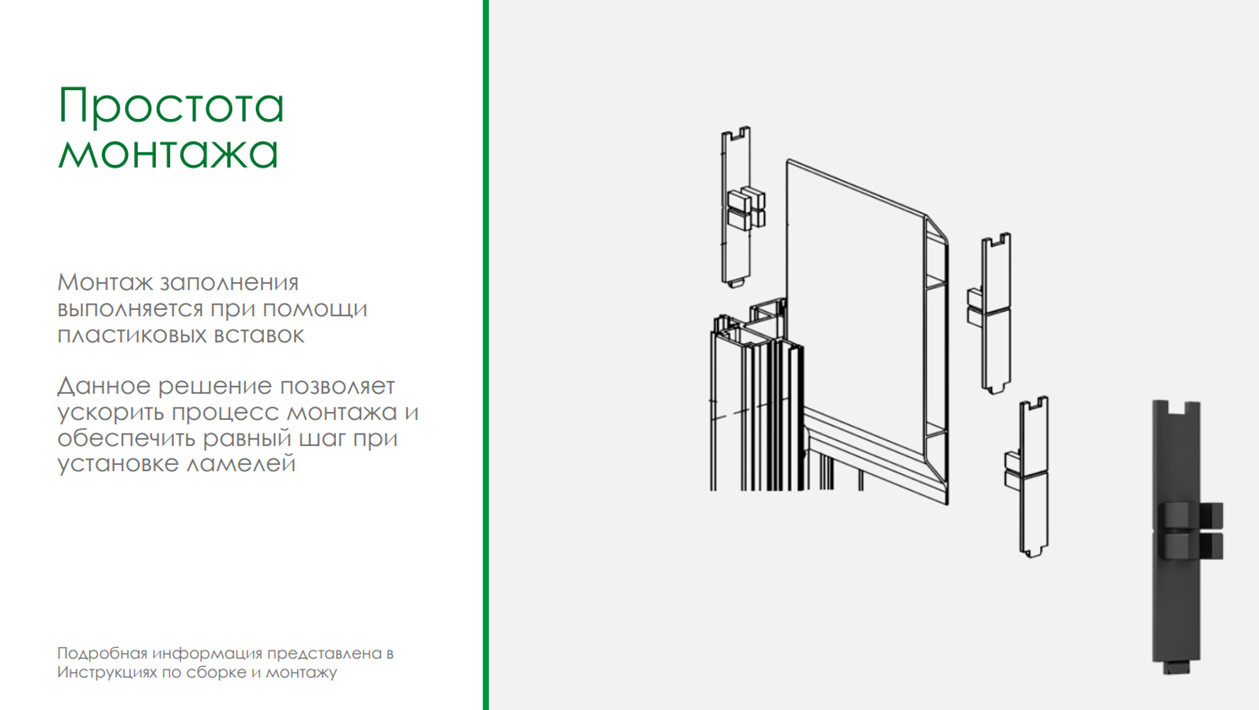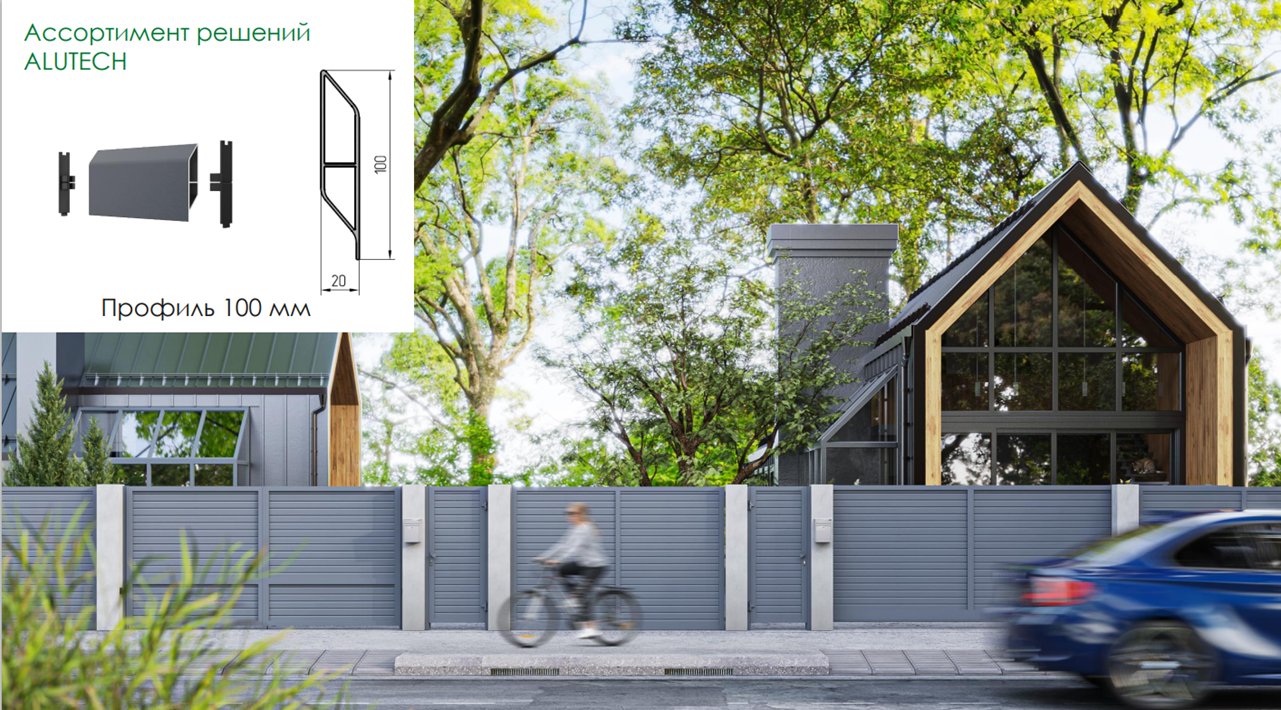 Ассортимент жалюзи ALUTECH включает алюминиевые профили высотой 100 и 200 мм. Для монтажа используются пластиковые вставки, которые ускоряют процесс и обеспечивают равномерный шаг ламелей.