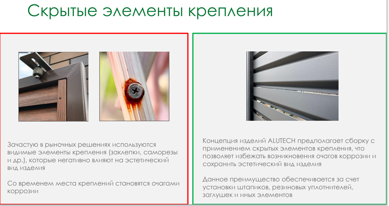 * Скрытые элементы крепления. Они предотвращают коррозию и сохраняют эстетику изделия.